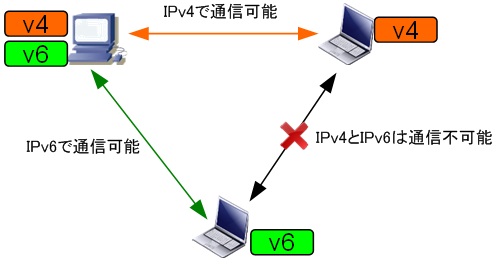 ・IPv4アドレスしか持たないコンピュータはIPv6アドレスしか持たないコンピュータと通信することができません。