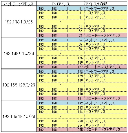 サブネットマスクを24ビット(/24)から26ビット(/26)にすることでネットワーク部を2ビット増やすことができます。
